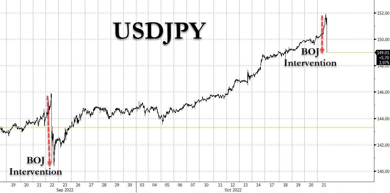 知名金融博客零对冲(ZeroHedge)发推称,日本央行昨夜的干预完全无用(completely useless intervention)。从美元兑日元走势图可以看出,在9月份日本央行干预过后,美元兑日元仍一路走高,并于本周突破150重要心理关口。