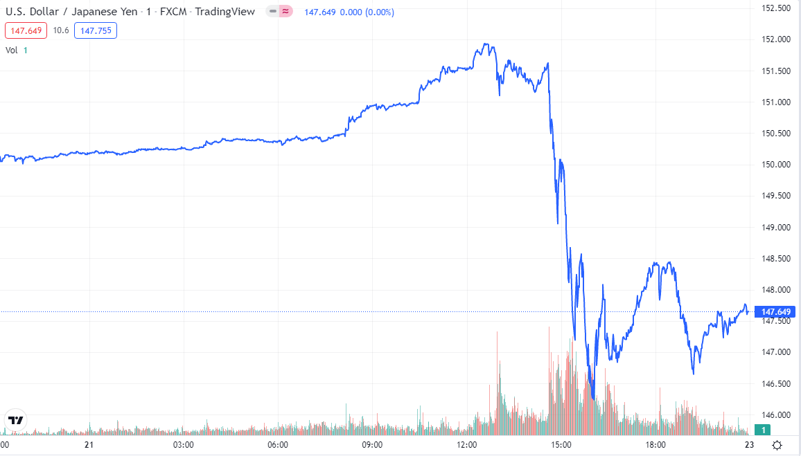 周五晚间,美元兑日元大幅跳水(图片来源:tradingview)