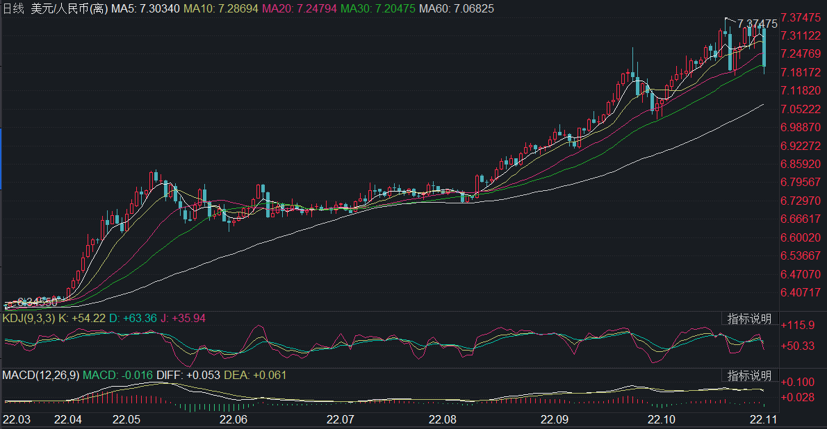 11月4日,离岸人民币对美元大涨,收复7.20关口,单日涨幅超过1500点。