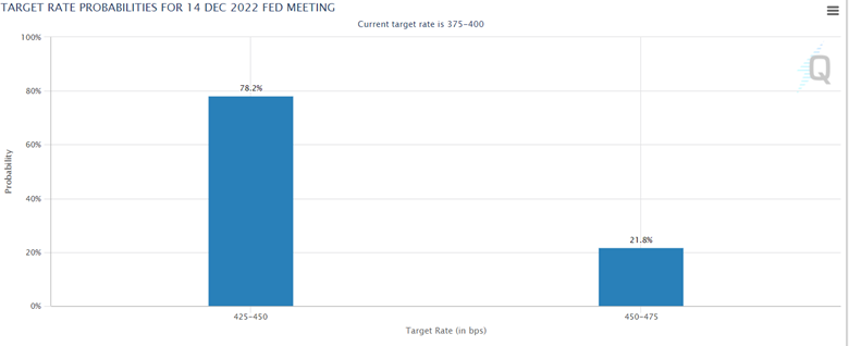 目前,利率期货数据显示,市场预期美联储12月加息50个基点的概率为78.2%;预期美联储12月加息75个基点的概率为21.8%。