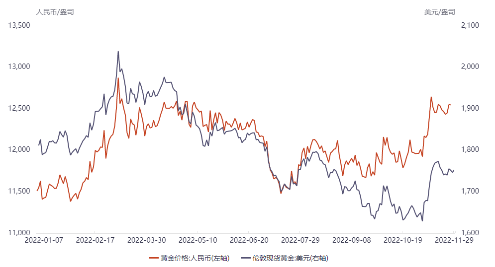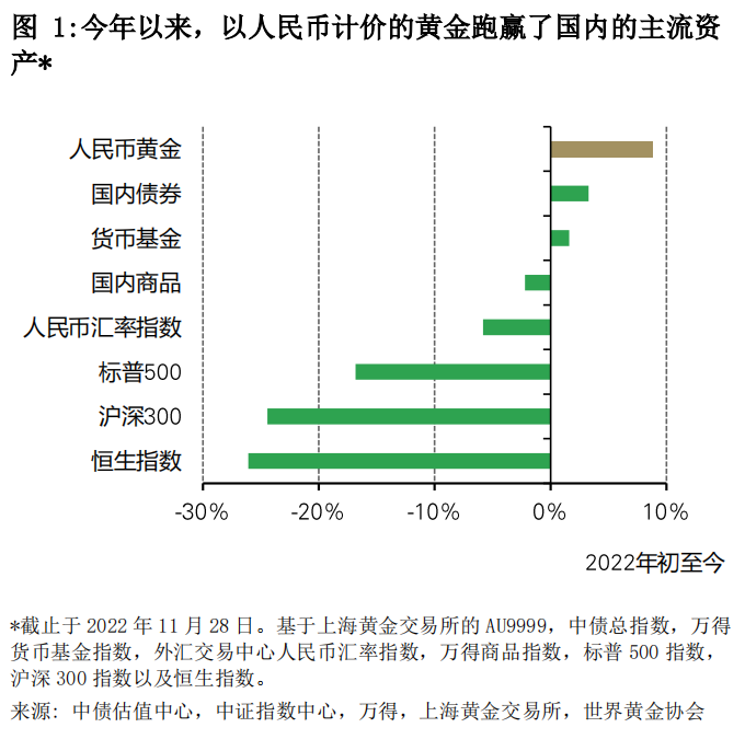 今年以来,受欧美地区经济衰退、公共卫生事件和地缘政治等因素影响,市场不确定性风险显著增长,全球主要风险资产均受到冲击。国内主流资产同样表现不佳。然而,以人民币计价的黄金价格却在年内上涨了9%,超越了国内债券、货币基金、国内商品等国内主流资产。
