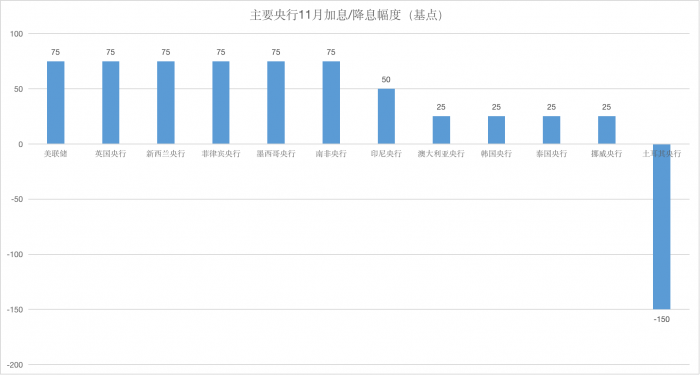在主要央行中,11月美联储连续四次加息75个基点,英国央行也罕见加息75基点,新西兰央行、菲律宾央行、墨西哥央行、南非央行、印尼央行均加息75个基点,而澳大利亚央行、韩国央行、泰国央行、挪威央行则小幅加息25个基点,向来特立独行的土耳其央行则再度降息150基点。