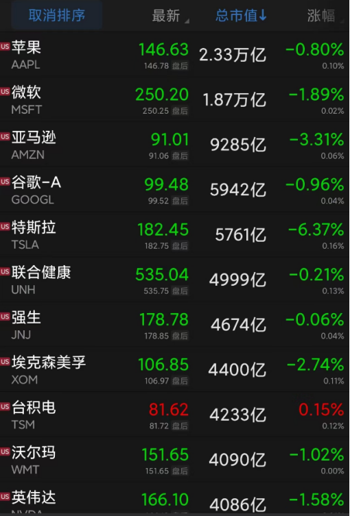 盘面上看,道指30只成份股中,仅波音录得上涨。大型科技股普跌,特斯拉跌6.37%,约390亿美元(折合人民币约2700亿元)市值蒸发,亚马逊跌3.31%,微软、英伟达跌超1%,脸书母公司Meta跌0.86%,苹果跌0.8%。