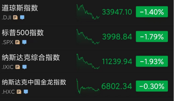 当地时间周一,美股三大指数收盘集体走低。道指跌1.4%,标普500指数跌1.79%,纳指跌1.93%。