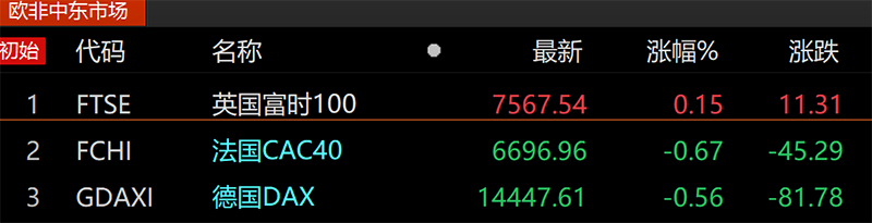 欧洲主要股指涨跌不一。欧洲斯托克50指数跌0.54%,德国DAX30指数跌0.56%,法国CAC40指数跌0.67%,英国富时100指数涨0.15%。