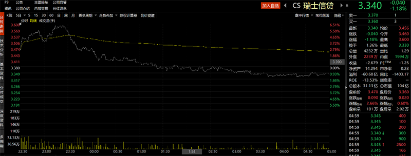 深陷舆论之中的瑞士信贷盘中一度逆势上涨近6%,但受市场整体拖累,最终收跌1.18%。