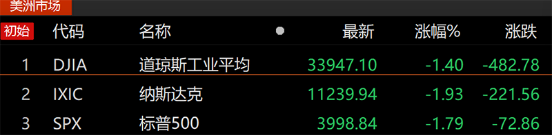 当地时间12月5日, 美股三大股指全线收跌,日内跌幅均超1%,创下11月10日以来单日最大跌幅。道琼斯指数跌1.4%,跌去482.78点,报33947.10点;标普500指数跌1.79%,跌去72.86点,报3998.84点;纳斯达克综合指数跌1.93%,跌去221.56点,报11239.94点。
