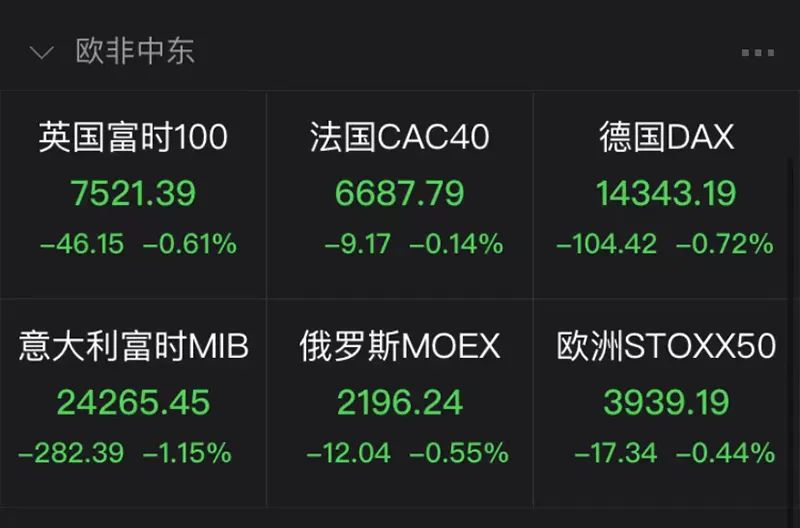 欧洲股市方面收盘同样全线下跌:德国DAX指数跌0.72%,下跌104.42点,报14343.19点;法国CAC40指数跌0.14%,跌9.17点,报6687.79点;英国富时100指数跌0.61%,下跌46.15点,报7521.39点。