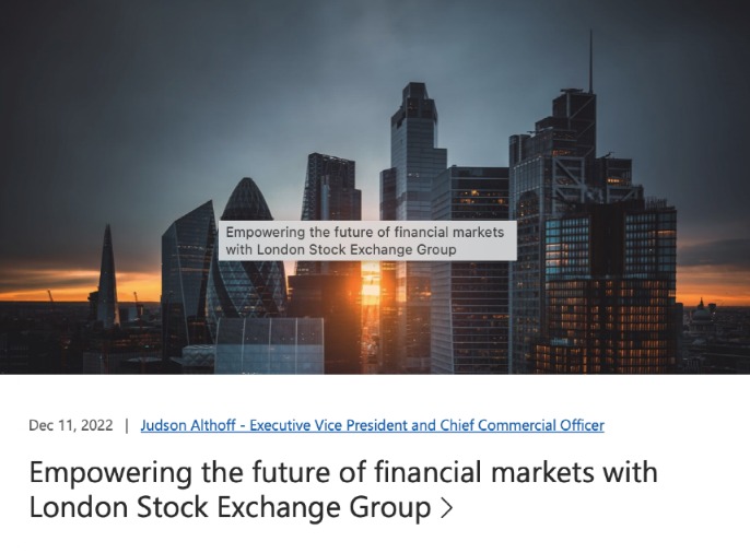 微软周一公告称,公司和伦敦证券交易所集团就下一代数据和分析及云基础设施达成10年战略伙伴协议,并将从Blackstone(黑石)、加拿大养老金和新加坡主权基金手中获得伦敦证交所约4%股权。