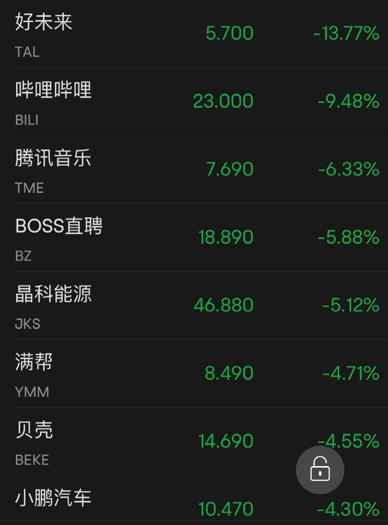 热门中概股多数下跌,虎牙直播跌16.57%,斗鱼跌16.56%,好未来跌13.84%,每日优鲜跌12.61%,途牛跌11.21%,哔哩哔哩跌9.48%,名创优品跌7.91%,陆金所控股跌7.61%,小牛电动跌6.88%;涨幅方面,九洲大药房涨114.8%,亿航智能涨37.45%,新濠影汇涨20.39%。中概新能源汽车股全线走低,蔚来汽车跌1.15%,小鹏汽车跌4.11%,理想汽车跌1.89%。