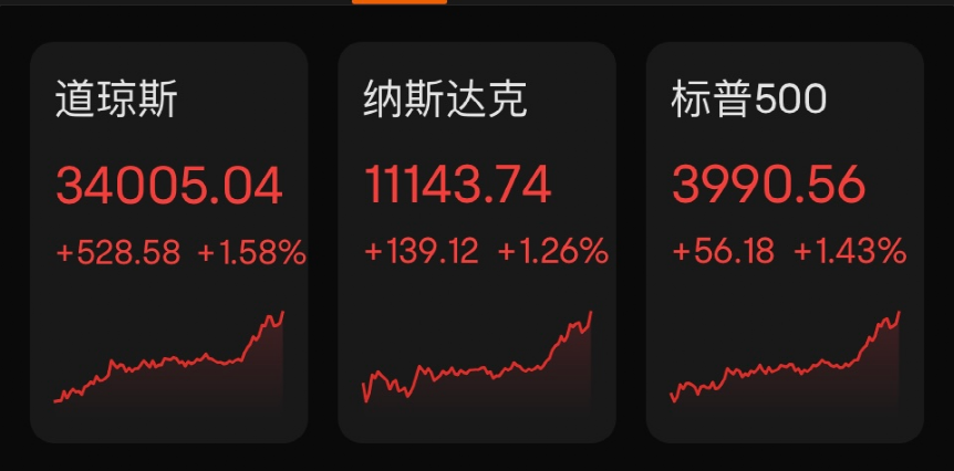 截至周一收盘,道指涨528.58点,涨幅为1.58%,报34005.04点;纳指涨139.12点,涨幅为1.26%,报11143.74点;标普500指数涨56.18点,涨幅为1.43%,报3990.56点。
