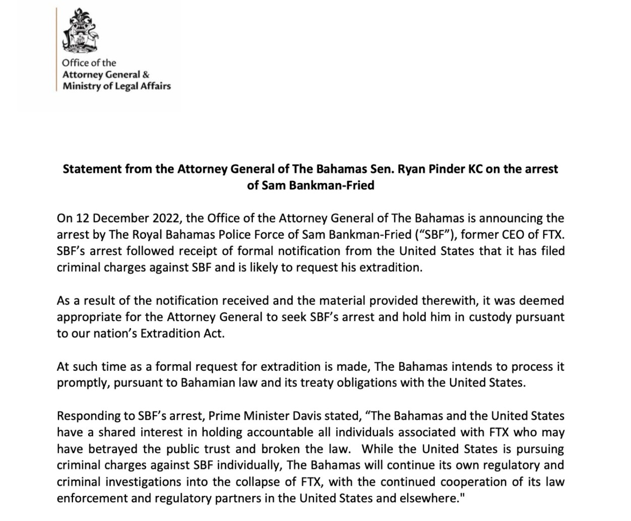 巴哈马司法部长办公室和法律事务部发布关于逮捕Bankman-Fried的声明