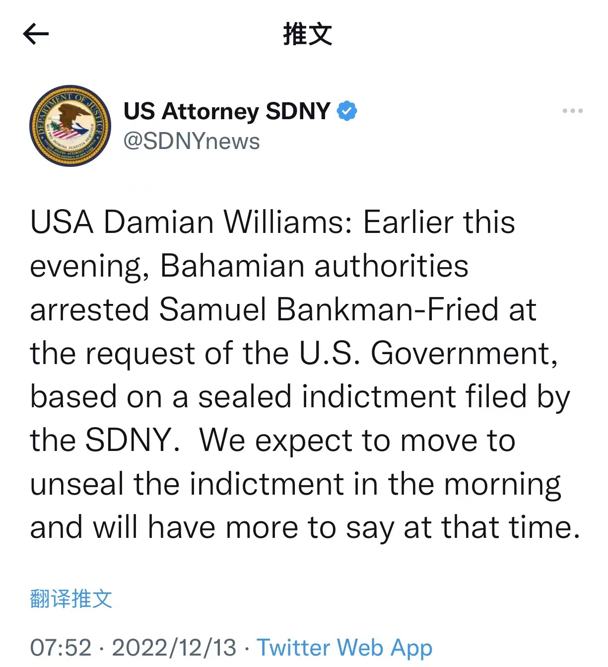 同日,纽约南区联邦检察官Damian Williams在社交平台上表示,预计将“在(当地时间12月13日)上午公布起诉书”,并证实了前述逮捕消息。