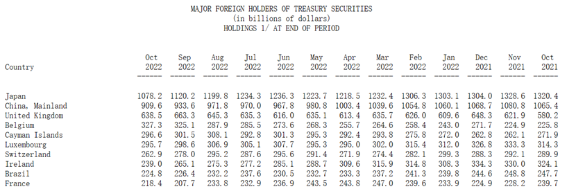 数据还显示,持有美国国债规模前十的国家和地区中,仅有比利时和法国在10月选择了增持,包括日本、中国在内的其余8个国家和地区全部减持了美债。
