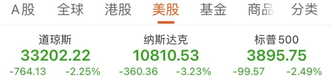 当地时间周四,美股低开低走,三大股指全线下跌。道指一度跌超900点,最终收跌764.13点,跌幅为2.25%,报33202.22点,创三个月来最大单日跌幅;标普500指数收跌99.57点,跌幅为2.49%,报3895.75点;纳指收跌360.36点,跌幅为3.23%,报10810.53点。