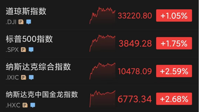 当地时间周四,美股三大指数高开高走,收盘显著收涨。道指涨1.05%,报收33220.80点。标普500指数涨1.75%,收于3849.28点。纳指涨2.59%,收于10478.09点。