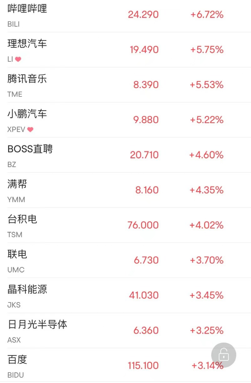 热门中概股多数收涨,哔哩哔哩涨6.72%,腾讯音乐涨5.53%,百度涨3.14%,阿里巴巴涨2.21%,京东涨1.67%,拼多多涨1.22%。