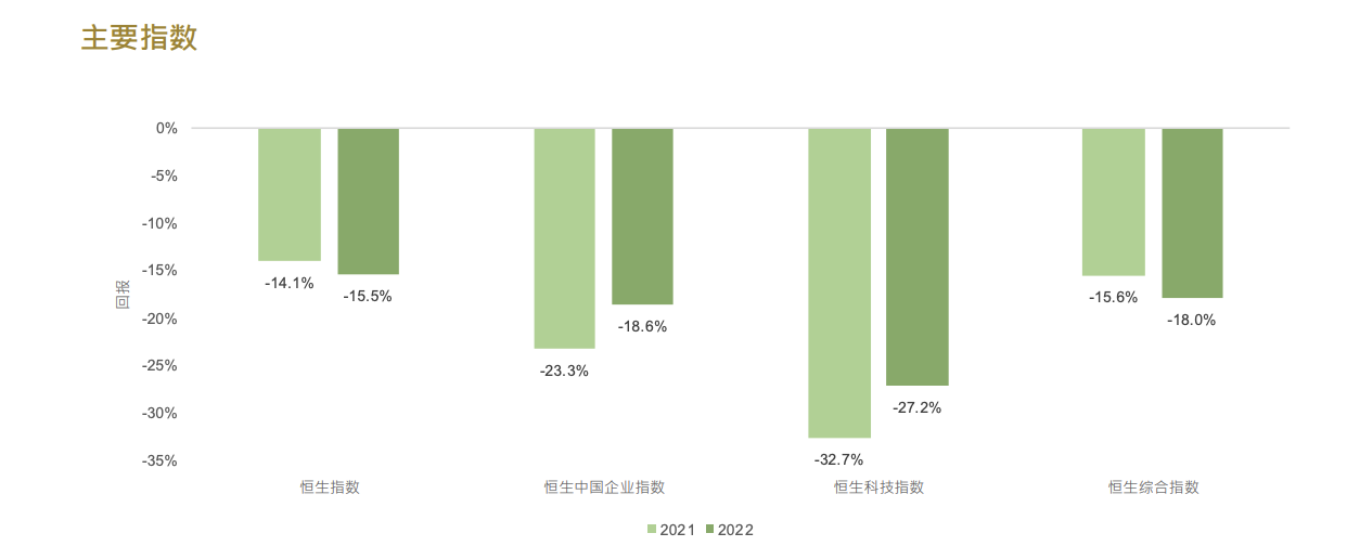 恒生指数2022年全年跌幅为15.46%,与上证指数相仿。港股自2022年初以来持续受压,主要是由于俄乌地缘政局紧张局势、美联储持续加息,加上疫情反复,以及房地产市场疲弱,导致投资气氛不振。步入第四季,在利好因素开始浮现支持下,港股修复年初以来的部份失地,但2022年全年依然报跌,并且为连续第三年下跌。2022年,恒生指数及恒生中国企业指数分别录得15.5%及18.6%的跌幅,恒生科技指数则下跌27.2%。