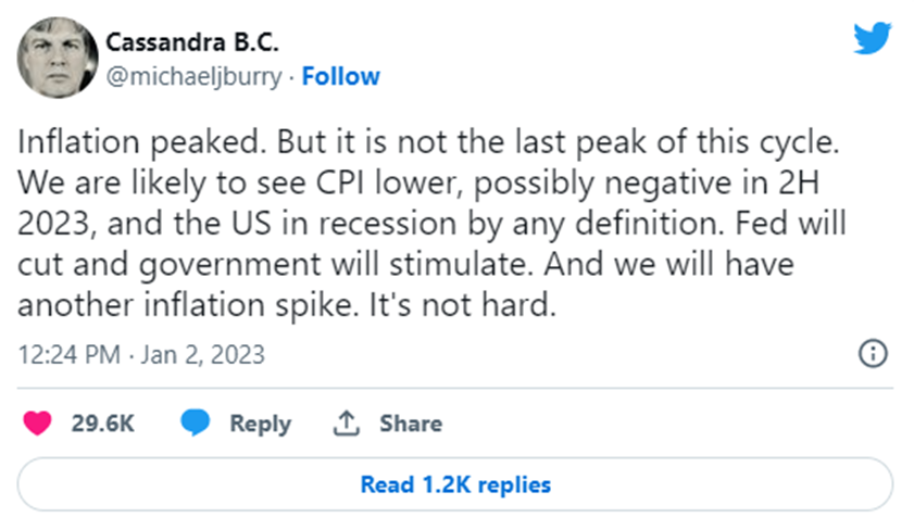 当地时间1月3日,华尔街传奇人物、电影《大空头》原型、Scion资产管理公司创始人Michael Burry发表了悲观预测,美国衰退已经成定局,而美联储将选择降息来刺激经济,从导致通胀再度飙升。