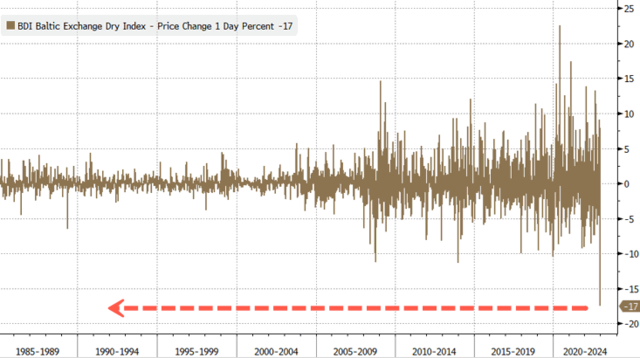 衡量全球经济前景的重要指标,突然遭遇史诗级暴跌。近日,波罗的海交易所的干散货海运费指数创出有记录以来的最大单日跌幅,其中,跟踪运载干散货大宗商品的好望角型、巴拿马型和超灵便型船运价的整体指数暴跌17.5%,这也是自1984年以来的最大单日跌幅。有分析人士认为,这一指数的暴跌无疑印证了市场对全球经济衰退的担忧。
