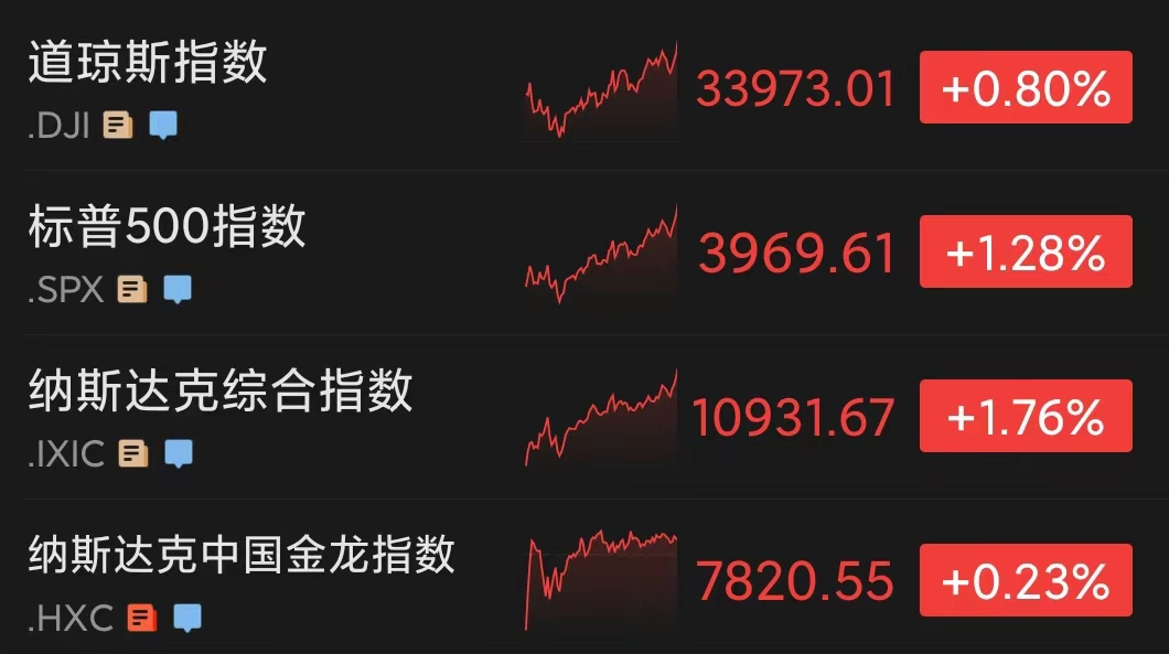 当地时间周三,美股三大指数高开高走,尾盘集体拉升。道指涨0.8%,报收33973.01点;纳指涨1.76%,收于10931.67点,自去年9月份以来首次录得连续4日上涨;标普500指数涨1.28%,报收3969.61点。