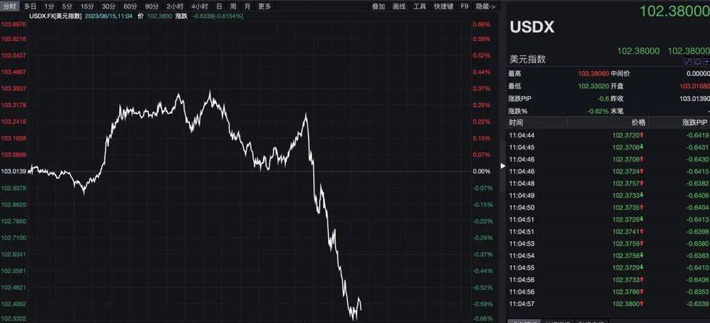 美元指数出现大幅跳水,日内上演大幅逆转行情。由最高涨超0.3%转为一度跌超0.6%,截至发稿跌0.62%,日内跌超600点,创近一个月新低。