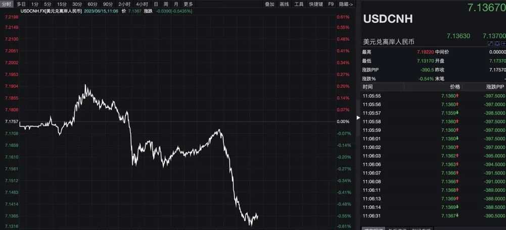 离岸人民币兑美元则大幅拉升,截至发稿涨超0.5%,日内涨近400点。