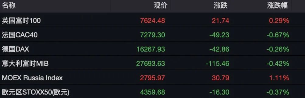 欧股方面,截至发稿,英国富时100指数涨0.29%,法国CAC40指数跌0.67%,德国DAX指数跌0.26%,意大利富时MIB指数跌0.42%。