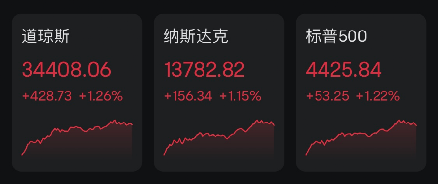 截至收盘,道指涨1.26%报34408.06点,标普500指数涨1.22%报4425.84点,纳指涨1.15%报13782.82点,标普500指数和纳指均录得连续第六日上涨。