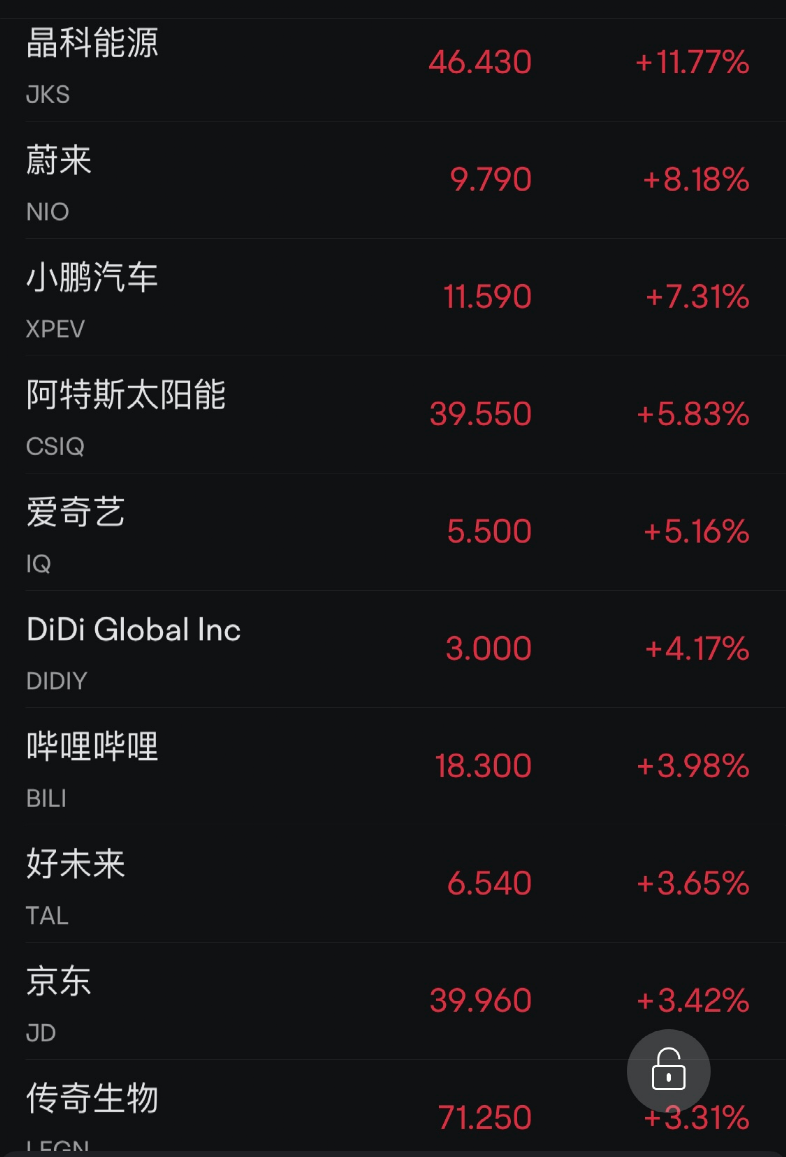 热门中概股普遍上涨,盛大科技涨20.66%,晶科能源涨11.77%,亿航智能涨9.49%,趣店涨9.04%,虎牙直播涨8.69%,达达集团涨7.84%,雾芯科技涨7.1%,图森未来涨6.42%,阿特斯太阳能涨5.83%,爱奇艺涨5.16%。