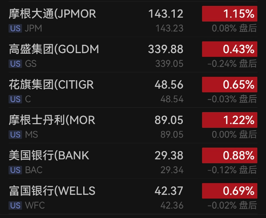 银行股集体上涨,摩根大通涨1.15%,高盛涨0.43%,花旗涨0.65%,摩根士丹利涨1.22%,美国银行涨0.88%,富国银行涨0.69%。