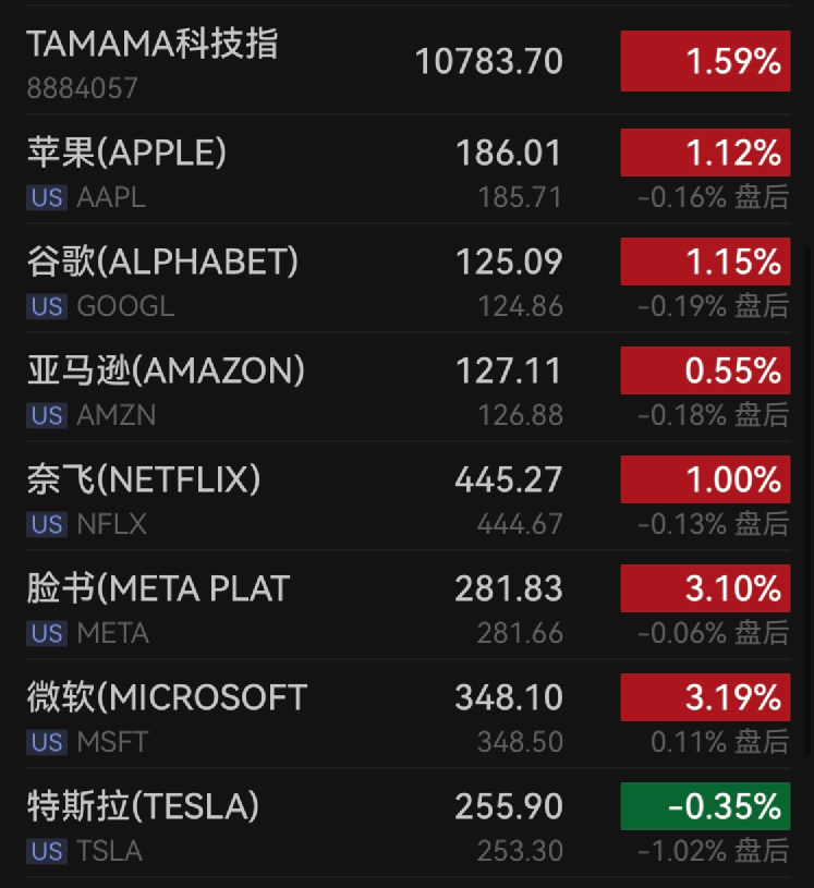 万得美国TAMAMA科技指数涨1.59%,苹果涨1.12%,亚马逊涨0.55%,奈飞涨1%,谷歌涨1.15%,脸书涨3.1%,微软涨3.19%,特斯拉跌0.35%