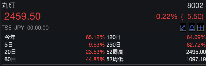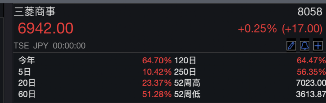 今年以来,五大商社的股价涨幅令市场瞩目,丸红和三菱商事均上涨65%左右,住友集团涨超42%,伊藤忠商事股价涨超37%,三井物产股价也上涨了近20%。