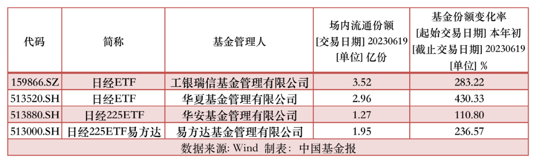 这4只基金近半年都有较为出色的表现,流入资金也在持续加大。场内流通份额最大的是工银瑞信旗下的日经225ETF,数据显示,截至6月19日,该ETF场内流通份额达到3.52亿份,年初以来的基金份额增长率达到283.22%。华夏野村日经ETF年初以来基金份额增长率更是直接暴涨430.33%。