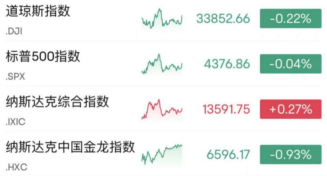 当地时间6月28日,美股三大股指涨跌不一,截至收盘,道指报33852.66点,下跌0.22%;标普500指数报4376.86点,下跌0.04%;纳指报13591.75点,上涨0.27%。