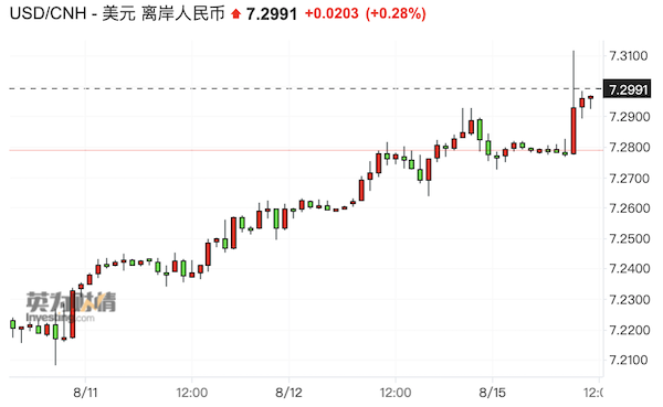 8月15日,离岸人民币对美元最弱跌至7.31附近,随后交投于7.29;在岸人民币走势相对偏强,交易员对记者表示,中间价的维稳信号强烈,逆周期因子影响变量近日都超过了700点,但15日汇率仍跌至7.25附近。当日,央行逆回购利率和MLF(中期借贷便利)分别“降息”10BP和15BP。