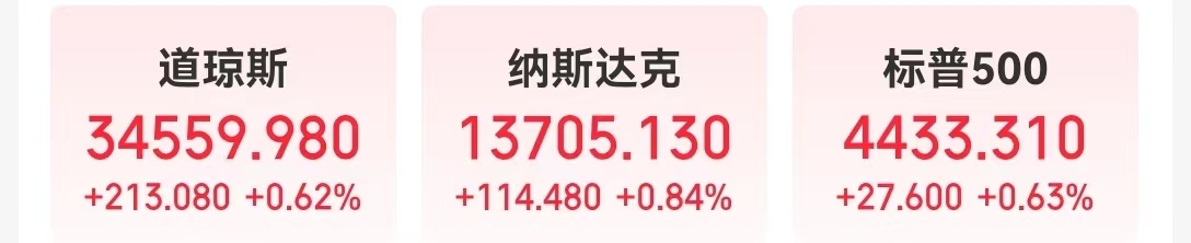 当地时间8月28日,美股三大指数集体收涨,道指上涨213.08点,涨幅0.62%,纳指涨0.84%,标普500指数涨0.63%。