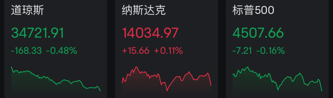 市场方面,美股三大指数收盘涨跌不一,道指跌168.33点,跌幅为0.48%,报34721.91点;标普500指数跌7.21点,跌幅为0.16%,报4507.66点;纳指涨15.66点,涨幅为0.11%,报14034.97点。