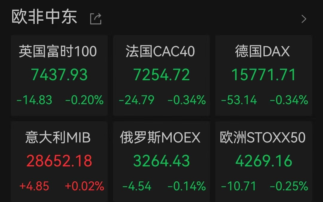 欧洲股市方面,隔夜主要股指同样收跌。截至收盘,英国富时100指数、法国CAC40指数、德国DAX指数分别下跌0.20%、0.34%、0.34%。