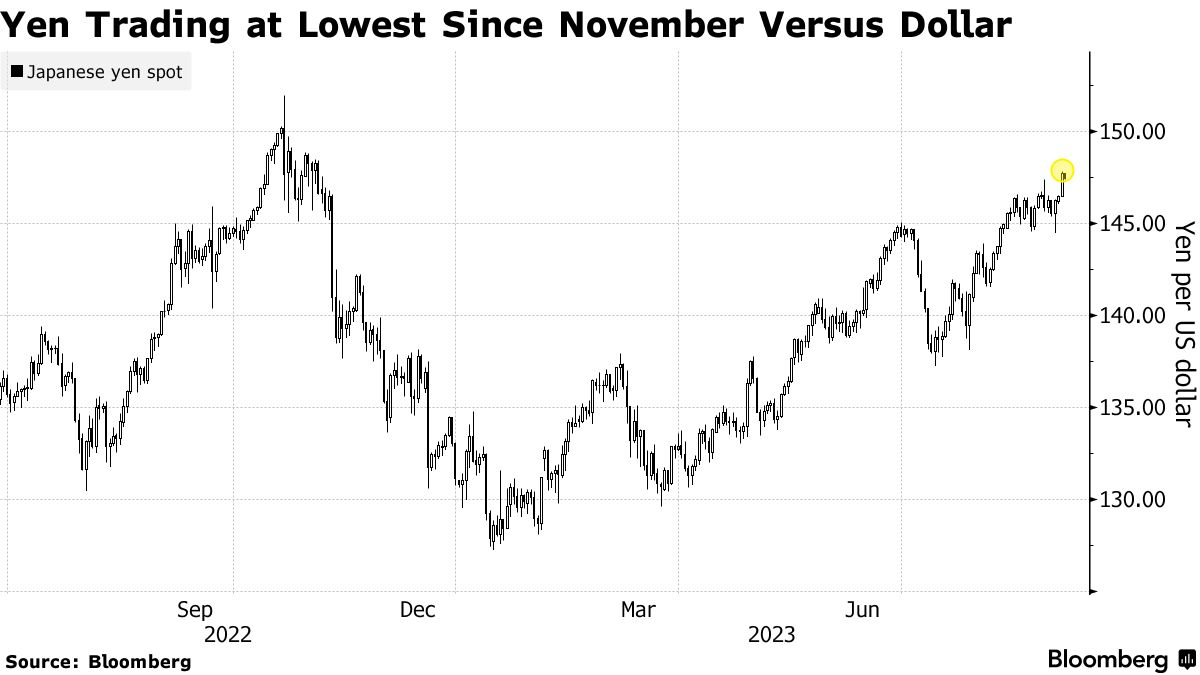 与其说当下是弱日元,不如说是强美元导致的结果:包括澳元、欧元和英镑在内的主要货币都不同程度地受到美元走强的打击。疲弱的经济数据让人们更加坚信,这些经济体的加息已经结束,例如,澳联储本周连续第三次“按兵不动”,但美国仍存在进一步加息的可能性。此外,加上美国公司债发行势头强劲,这推高了美债收益率,因此也增强了美元相对于其他货币的吸引力。