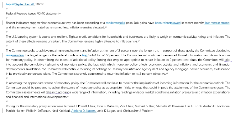 如市场所料,美联储在9月会议上没有调整政策利率,继续维持在5.25%-5.50%的位置。与7月FOMC文本措辞对比来看,两者之间的差别非常小。美联储把经济活动扩张的措辞从适度(Moderate)改成了坚固(Solid),同时美联储也把就业增长的措辞改成“有所放缓,但依然维持强劲”,今天的决议一共就这两点变化。