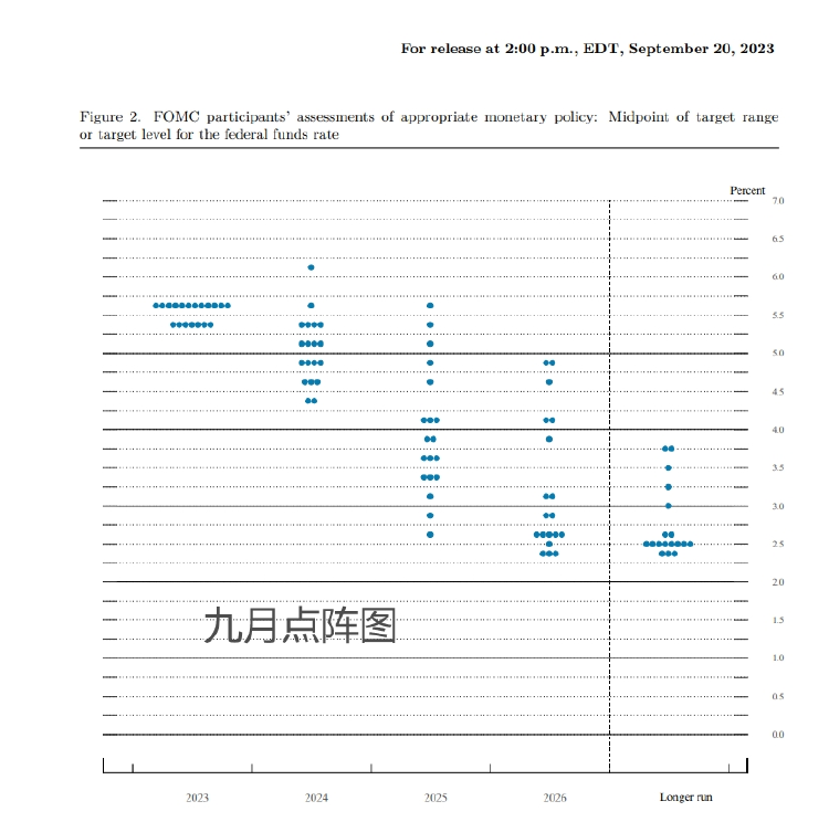 美联储点阵图显示,预计2023年年底的联邦基金利率为5.6%,预计2024年年底的联邦基金利率为5.1%。