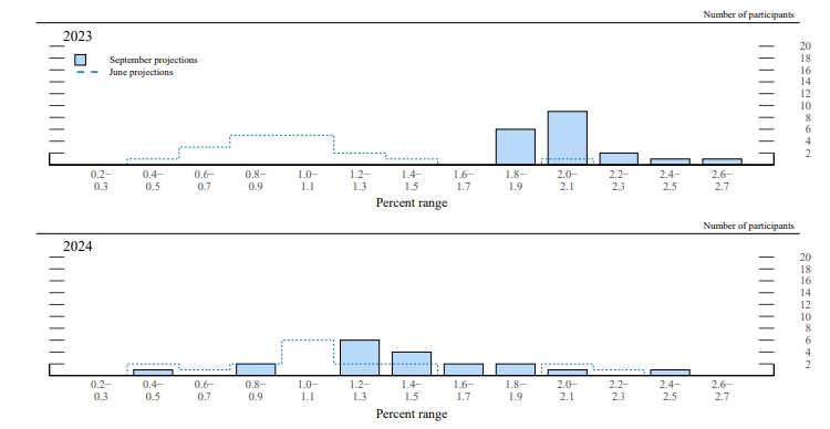 有评论认为,本次点阵图中,联储对明年的展望明显更为鹰派,这是最影响市场的一点。6月的上次点阵图中,最高频的预期明年利率水平为4.375%,而本次点阵图显示在4.875%到5.375%之间。