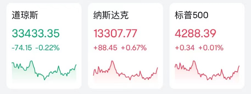 截至收盘,道指收跌74.15点,跌幅0.22%,报33433.25点。标普500指数收涨0.34点,涨幅0.01%,报4288.39点。纳指收涨88.45点,涨幅0.67%,报13307.77点。