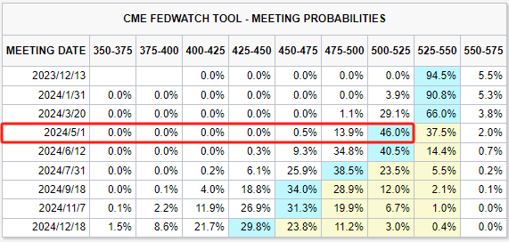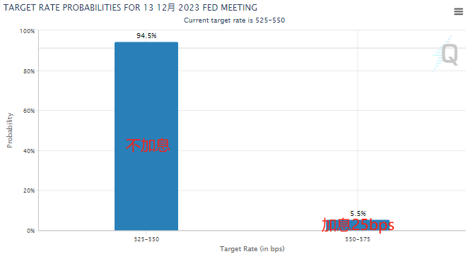 芝商所“美联储观察”工具显示,10月份CPI数据出炉后,美联储在下个月进一步加息25个基点至5.50%~5.75%区间的概率只有5.5%,大幅低于数据公布前的28%。