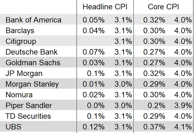 这其实也令不少华尔街投行的预测,如今正变得极为接近。如下图这张“新美联储通讯社”统计的华尔街大行对CPI数据的最新预测所示,所有的预估差基本都在预测中值的0.1个百分点以内: