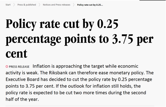 就在日本央行还在犹豫是否加息以抑制日元贬值时,瑞典央行周三宣布降息,将基准利率从4.00%下调至3.750%,成为继瑞士央行之后第二家采取宽松政策的发达国家央行。分析认为,欧元区央行或接棒瑞士和瑞典,成为欧美首个降息的主要央行。
