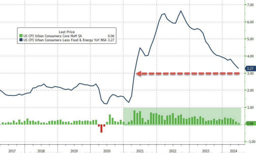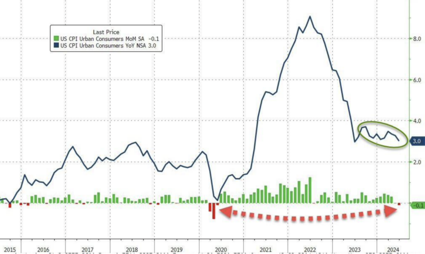 北京时间7月11日晚间,美国劳工部发布的数据显示,美国6月CPI同比上涨3%,低于预期的3.1%,较前值3.3%进一步下滑;环比下降0.1%,亦低于预期的0.1%和前值的0%,为2020年5月以来首次转负。