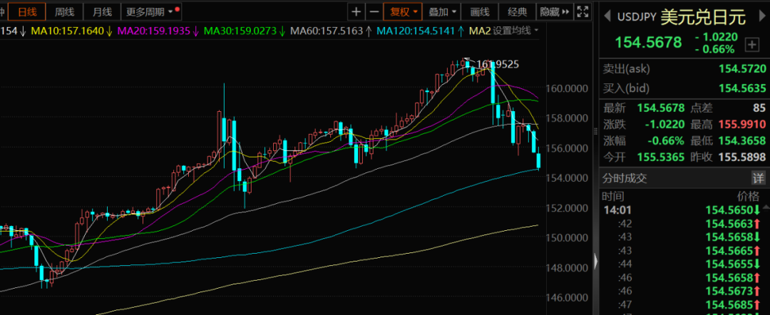 同期,日元汇率却持续走强。今天是日元连续第三天走强的交易日,美元兑日元失守155水平。交易员期待下周日本央行的政策会议,且普遍认为,日本政府会支撑日元。据彭博社调查,只有约30%的日本央行观察者预测当局将在7月31日加息,但超过90%的人认为存在加息的风险。