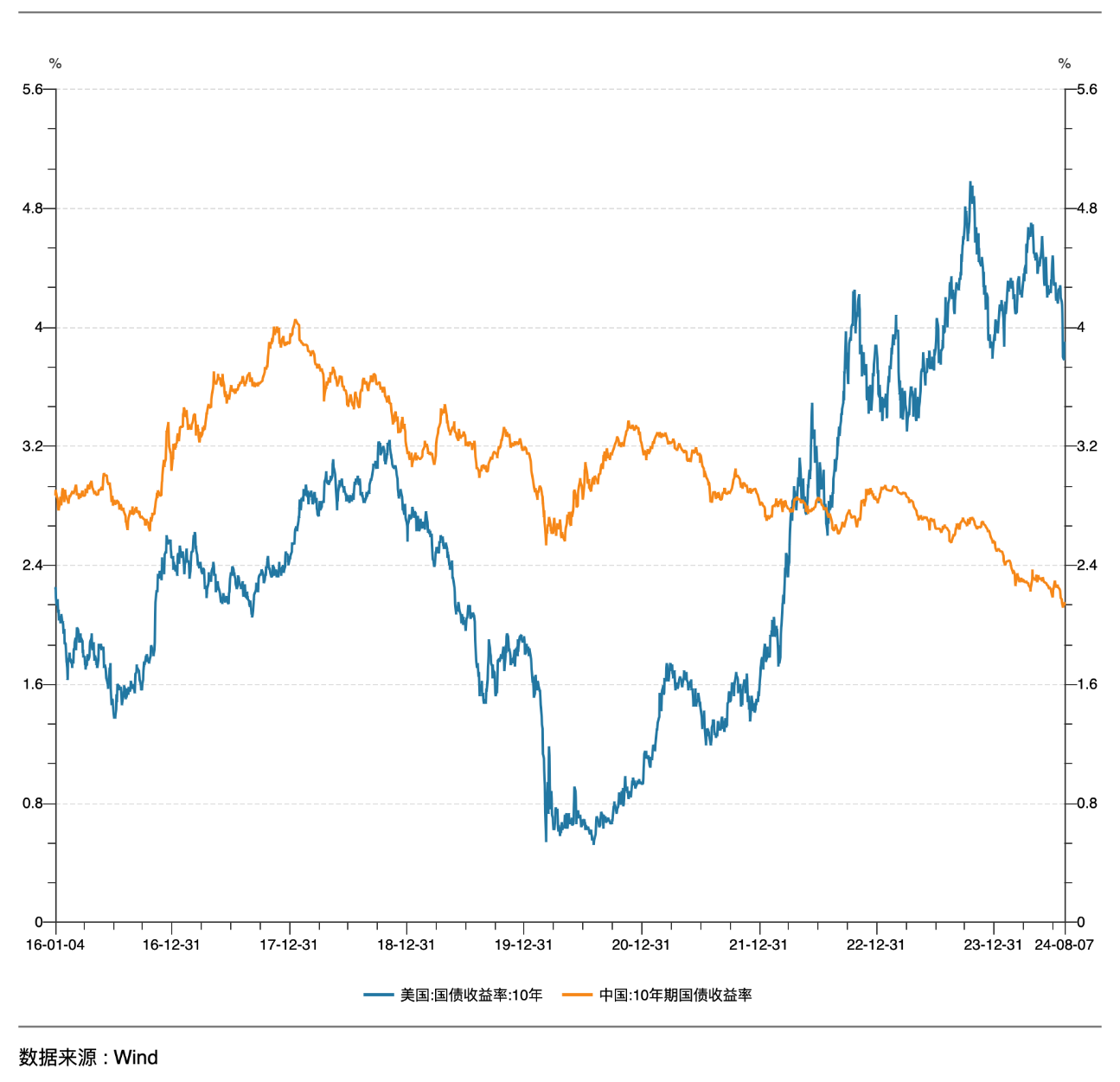 实际上,从中美利差来看,截至8月9日,中国10年期国债收益率为2.19%,美国10年期国债收益率3.94%,中美利差倒挂幅度为175个基点,相较年中的237个基点的历史高位,已出现明显下滑,但总体仍处历史高位。